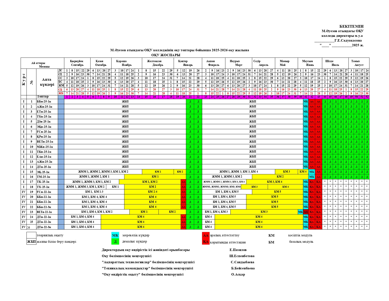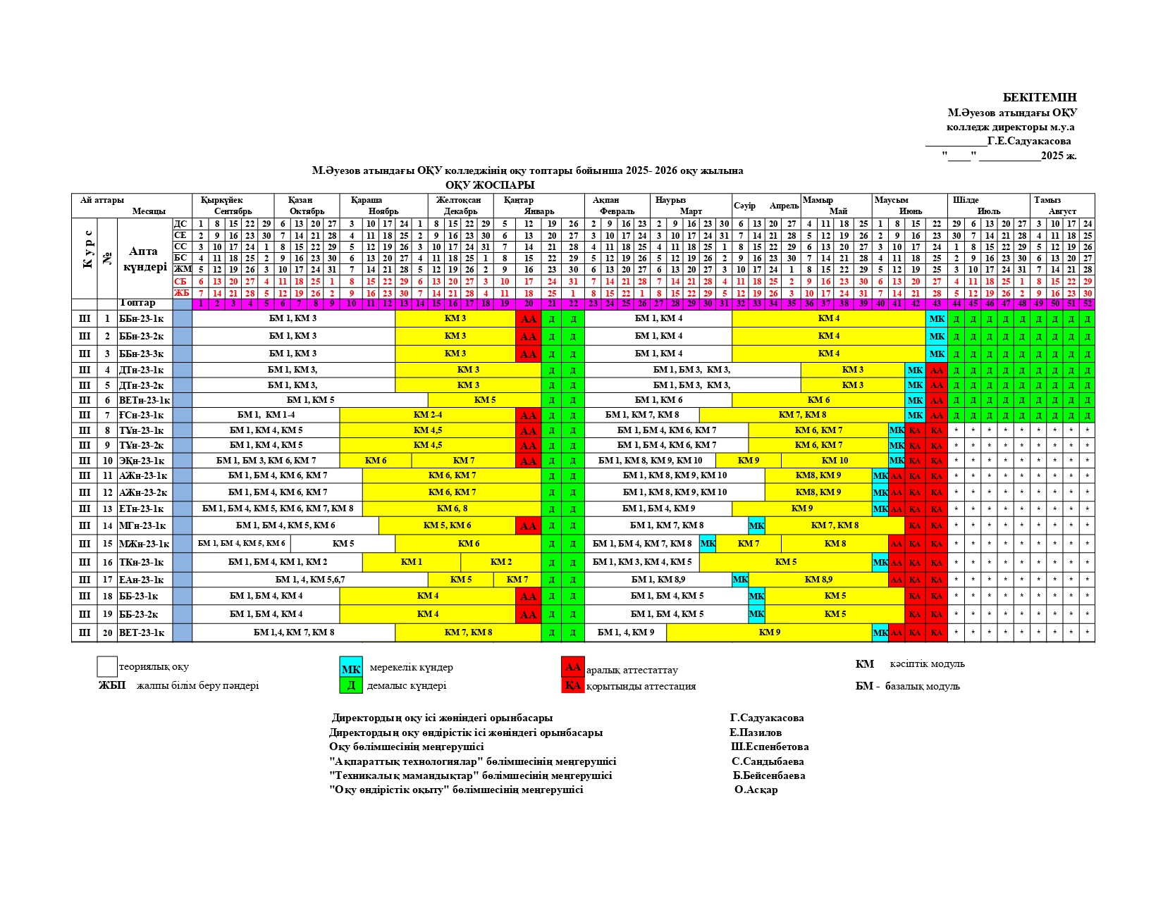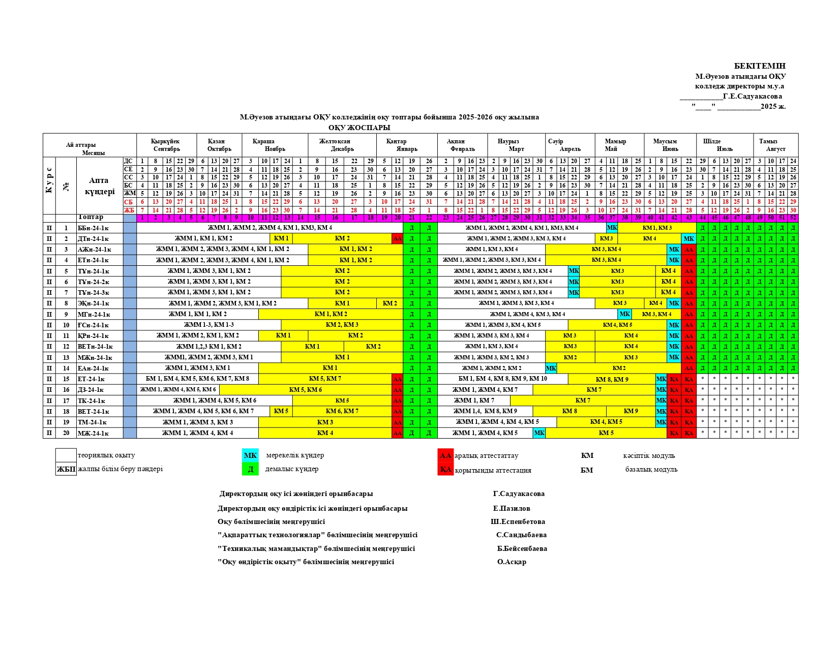 Оқу үдерісі Мемлекеттік емтихан кестесіЕмтихан кестесіДемонстрациялық емтиханАпталықДипломдық жобаны қорғау кестесіКурстық жұмыс Мекемелермен келісім-шарттарАшық сабақтарМ. Әуезов атындағы ОҚУ колледжінің 2025-2026 оқу жылына ОҚУ ЖОСПАРЫ+++ Артқа Алға Twitter Twitter Facebook Whatsapp share with Whatsapp Telegram share with Telegram